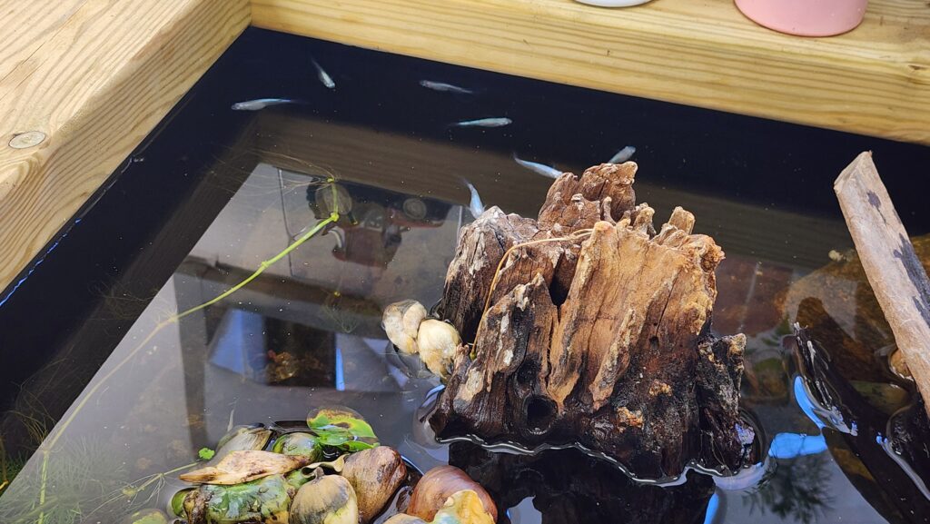 昨日、園内のメダカさん達を、大きい子と小さい子に分けて場所移動をしました。