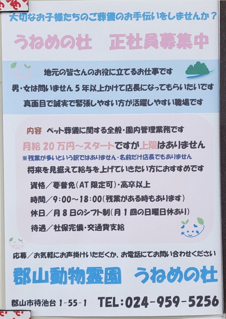 郡山動物霊園うねめの杜福島ペット火葬では、正社員さんを募集しております。明日2/22(日)福島県の地元企業様の求人広告、ガイドポスト様から正社員募集の広告が出ます。